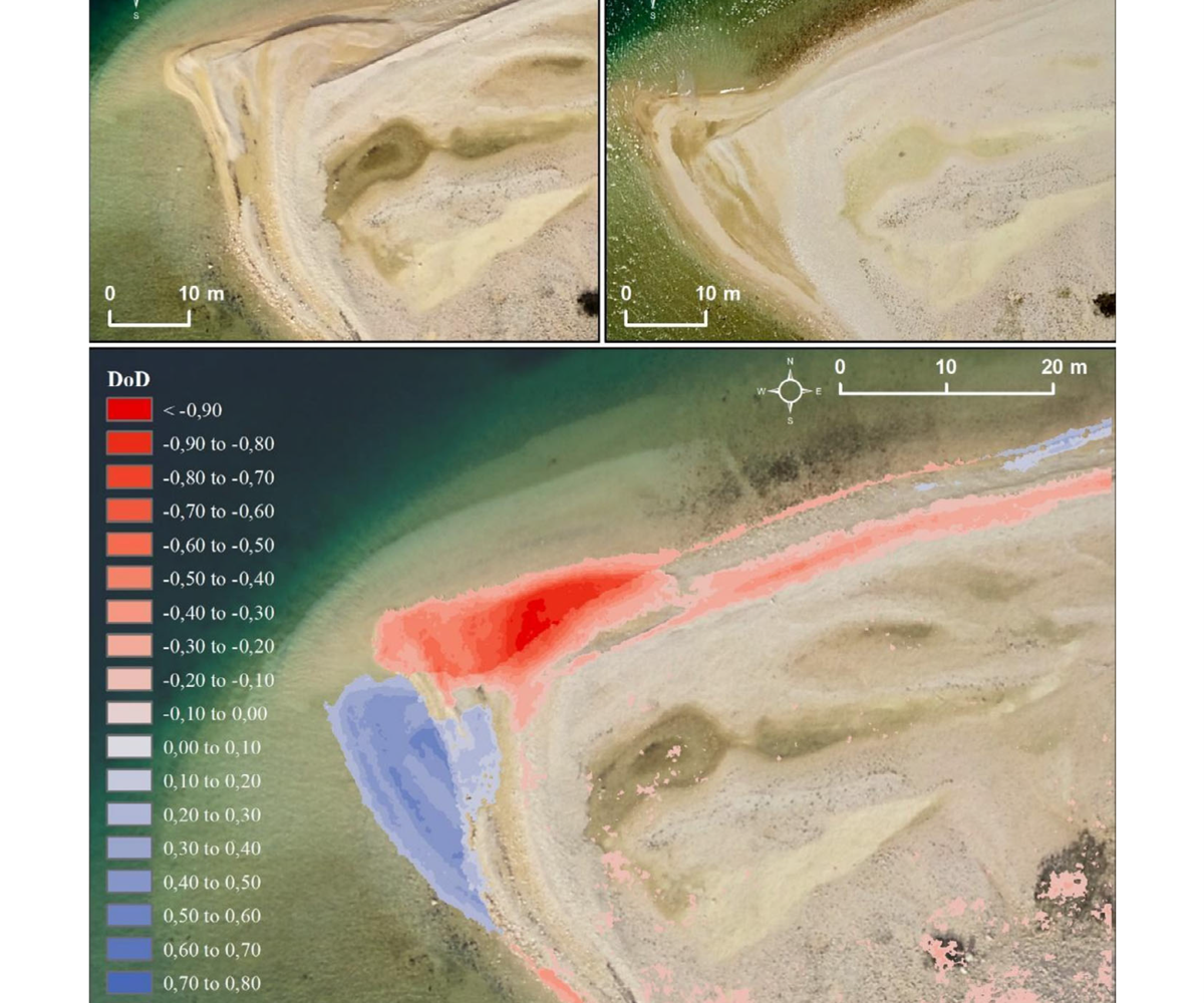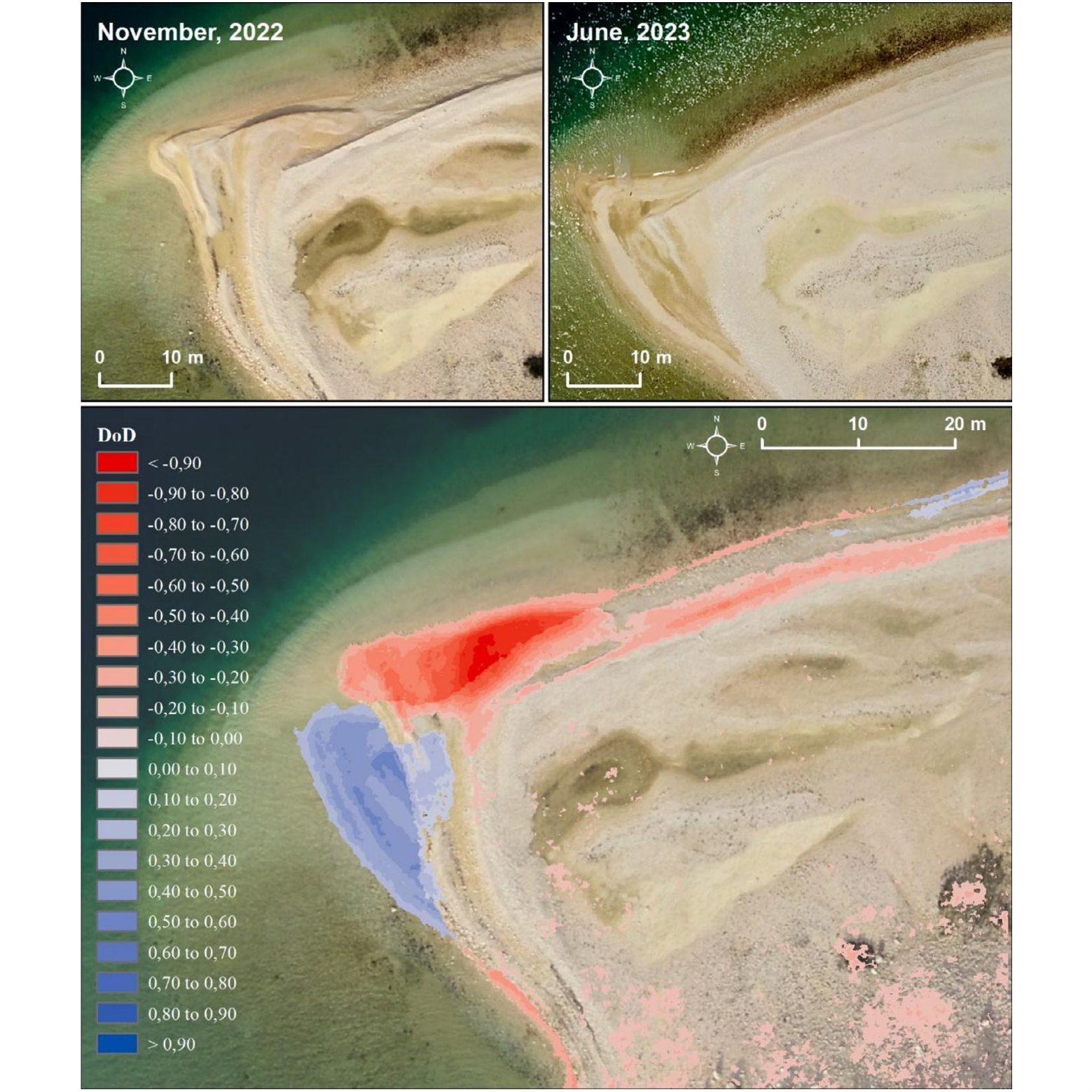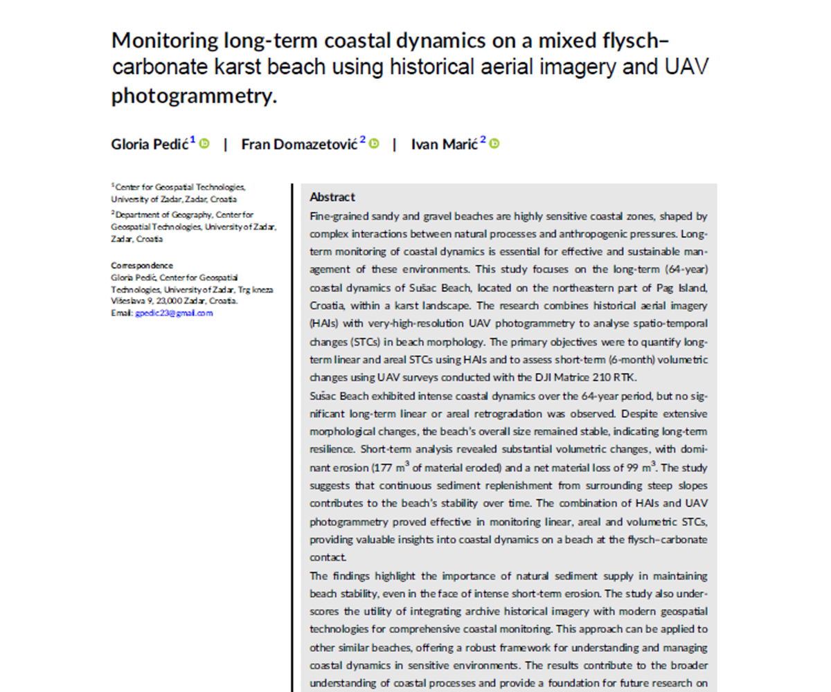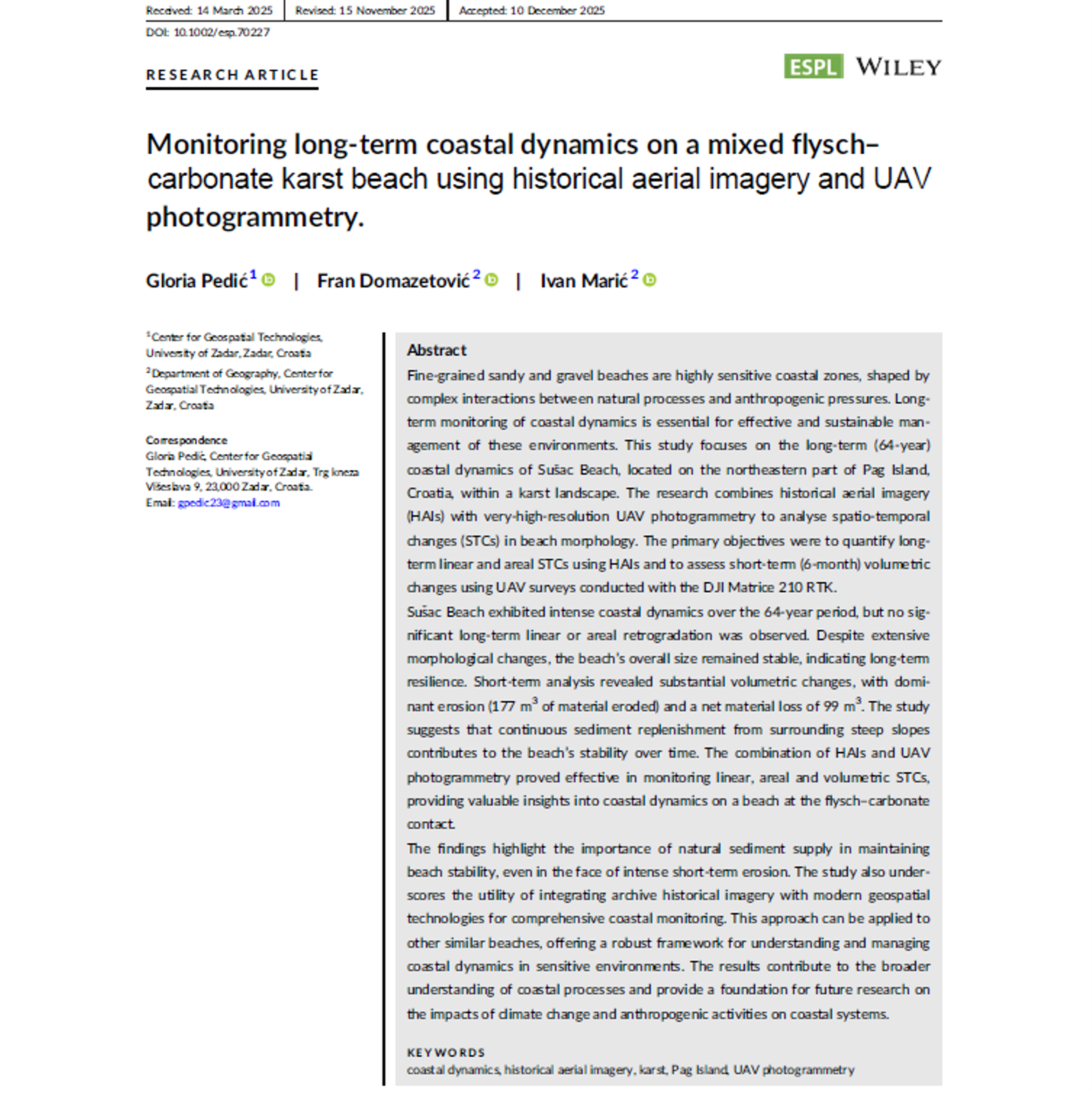 Članovi Centra za geoprostorne tehnologije, u suradnji s našom bivšom studenticom Gloriom Pedić, objavili su znanstveni rad u uglednom časopisu Earth Surface Processes and Landforms (John Wiley & Sons, u ime British Society for Geomorphology), a istraživanje je proizašlo iz njezina diplomskog rada. U radu je prikazana analiza 64 godine dinamike obale plaže Sušac na otoku Pagu, pri čemu su kombinirane povijesne zračne snimke i vrlo visokorezolucijska UAV fotogrametrija. Rezultati upućuju na izrazito dinamičnu obalu bez dugoročnog povlačenja, uz stabilnu površinu plaže unatoč intenzivnim kratkoročnim erozijskim epizodama. Tijekom samo šest mjeseci erodirano je približno 177 m³ sedimenta, no prirodna dopuna sedimentom osigurava dugoročnu otpornost sustava. Istraživanje dodatno potvrđuje vrijednost integracije povijesnih i suvremenih geoprostornih podataka te pokazuje kako napredne geoprostorne tehnologije mogu pružiti pouzdanu znanstvenu podlogu za održivo upravljanje osjetljivim obalnim okolišima.