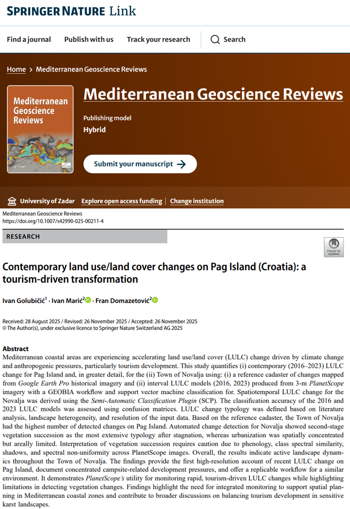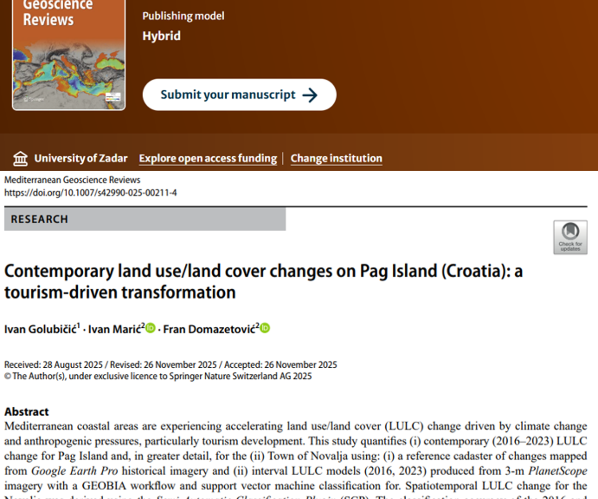Objavili smo novi znanstveni rad u časopisu Mediterranean Geoscience Reviews (2661-8648) pod naslovom „Contemporary land use/land cover changes on Pag Island (Croatia): a tourism-driven transformation“. Istraživanje donosi ažuran uvid u recentnu dinamiku promjena načina korištenja i pokrova zemljišta na otoku Pagu, s posebnim naglaskom na područje Grada Novalje. Rezultati upućuju na snažan utjecaj turistički potaknutog razvoja i prateće infrastrukture na oblikovanje krajolika, dok drugi dijelovi otoka pokazuju nastavak prirodne vegetacijske dinamike i promjene povezane s različitim oblicima poremećaja, što naglašava kako višestruki pritisci mogu preoblikovati mediteranska obalna okruženja. Autori ističu važnost kontinuiranog i integriranog monitoringa kao potpore prostornom planiranju i održivom upravljanju te predstavljaju ponovljiv metodološki pristup koji kombinira vizualnu interpretaciju s klasifikacijom temeljenom na satelitskim snimkama visoke rezolucije, uz preporuke za buduća unaprjeđenja. Autori rada su Ivan Golubičić, Ivan Marić i Fran Domazetović.