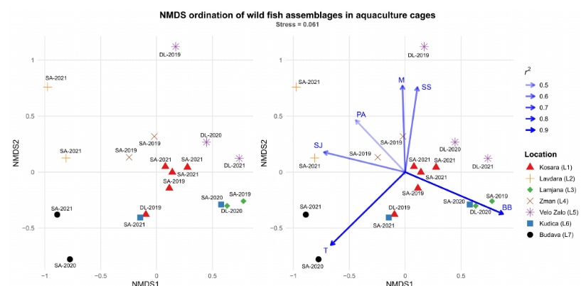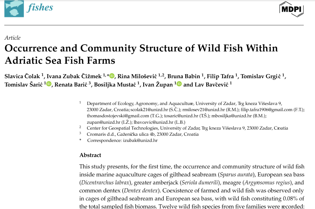 Članica našeg tima Rina Milošević, u suradnji s kolegama s Odjela za ekologiju, agronomiju i akvakulturu Sveučilišta u Zadru, objavila je u časopisu Fishes rad pod naslovom “Occurrence and Community Structure of Wild Fish Within Adriatic Sea Fish Farms” (DOI: 10.3390/fishes10100504). Istraživanje donosi prvi sustavni prikaz pojave divljih riba unutar morskih kaveza u Jadranu: zabilježeno je 12 vrsta iz pet porodica, pri čemu su najčešće bile bugva i šarun. Iako su činile svega 0,08 % ukupne biomase, prisutnost im je potvrđena na više uzgajališta. Analize su pokazale da lokacija farme značajno utječe na sastav zajednice, dok vrsta uzgajane ribe i trajanje uzgoja nisu imali značajan učinak. U kavezima predatorskih vrsta (npr. zubatac, gof) divlje ribe nisu zabilježene. Zanimljivo, bugve su unutar kaveza imale bolju kondiciju i veće dimenzije nego u prirodi, što upućuje na prilagodbu uvjetima uzgoja i stabilan dotok hrane. Rezultati pridonose razumijevanju odnosa između uzgojenih i divljih populacija te naglašavaju potrebu daljnjih istraživanja bio-sigurnosnih rizika u morskoj akvakulturi. Autori rada su: Slavica Čolak, Ivana Zubak Čižmek, Rina Milošević, Bruna Babin, Filip Tafra, Tomislav Grgić, Tomislav Šarić, Renata Barić, Bosiljka Mustać, Ivan Župan i Lav Bavčević.