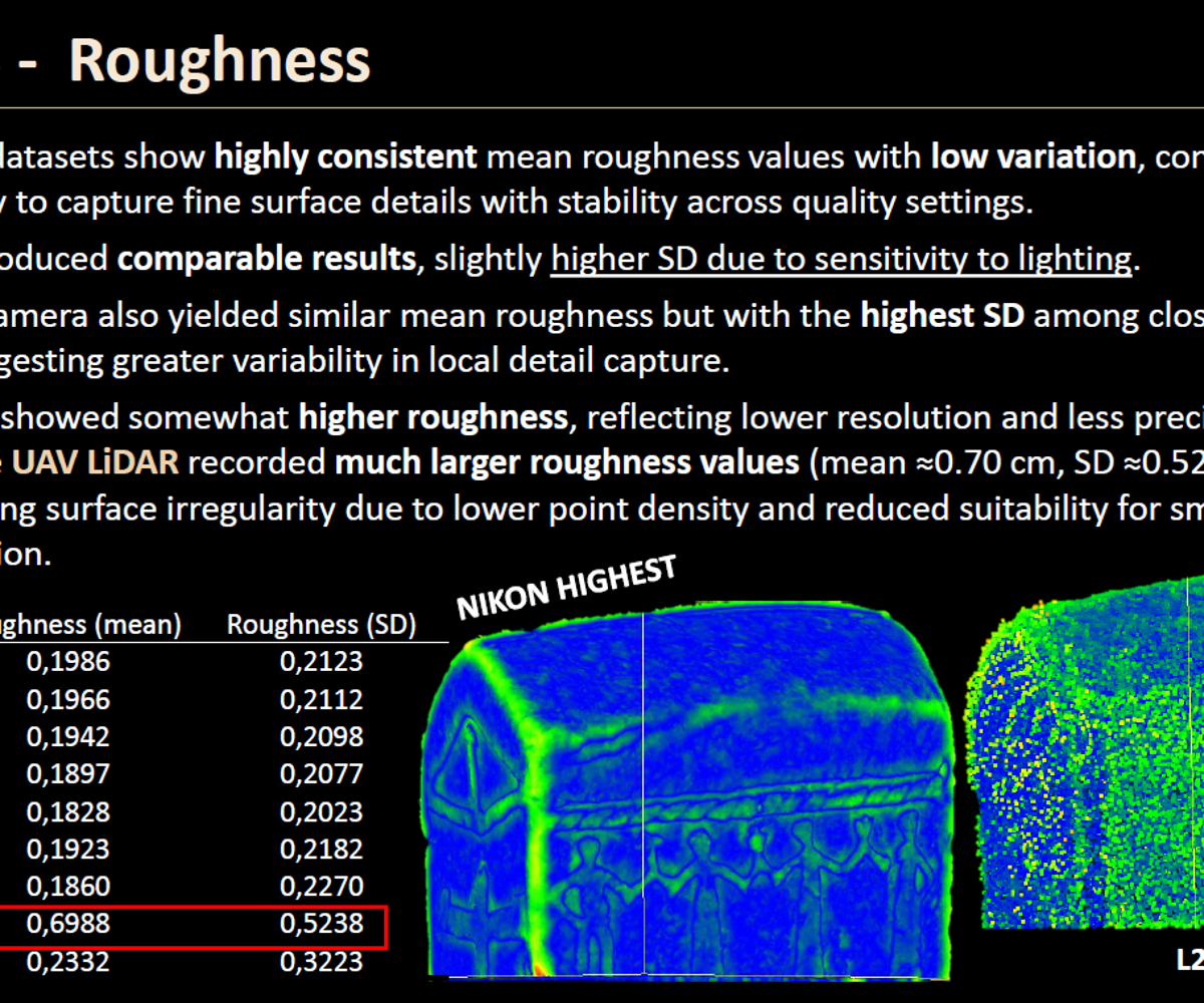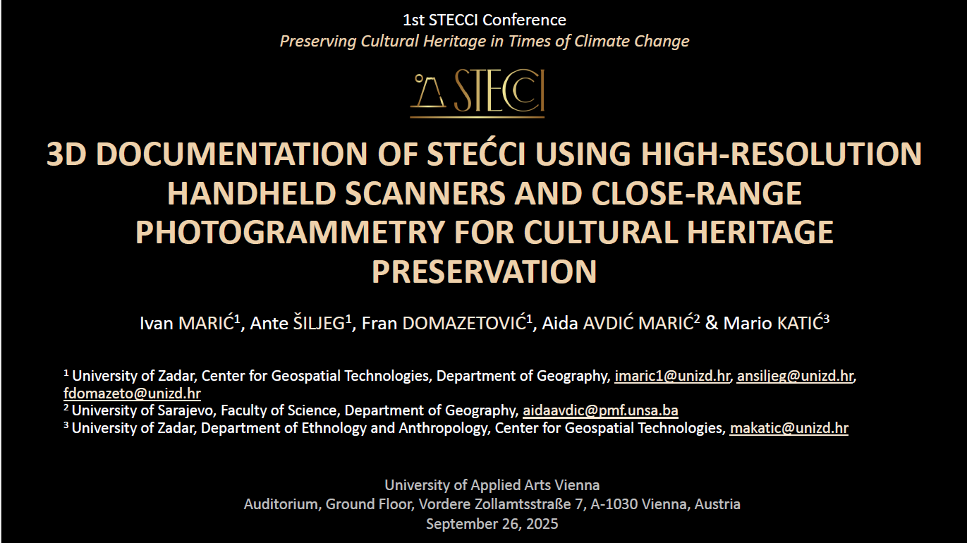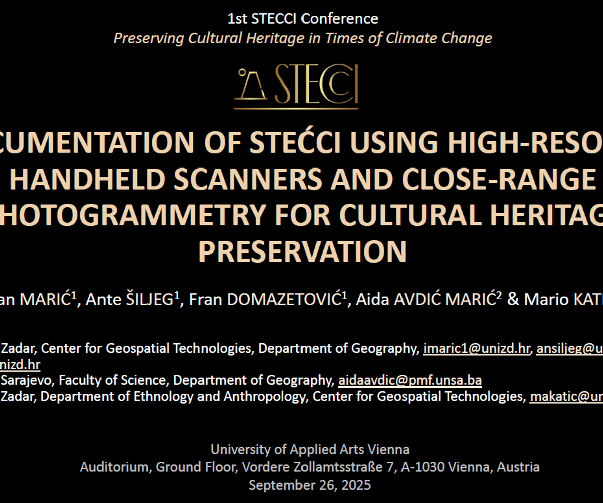 Centar za geoprostorne tehnologije (GAL) sudjelovao je na konferenciji „1st STECCI Conference: Preserving Cultural Heritage in Times of Climate Change“, održanoj 25.–27. rujna 2025. na University of Applied Arts Vienna, gdje smo predstavili rad „3D dokumentiranje stećaka upotrebom visokorezolucijskog ručnog 3D skenera i bliskopredmetne fotogrametrije za očuvanje kulturne baštine“. U okviru EU Horizon STECCI projekta, pokrenutog 2023. u svrhu razvoja održivih i inovativnih strategija zaštite europske kulturne baštine s posebnim naglaskom na stećke i rizike povezane s klimatskim promjenama, proveli smo snimanja na lokalitetu Crlivički stećci i bunari kod Imotskog (Hrvatska). U procesu prikupljnja podataka korišteni su Artec Eva (strukturirano svjetlo), DSLR sustav Nikon D5300 s objektivom AF-S DX Nikkor 18–105 mm te UAV DJI Matrice 300 s kamerom P1 i L2 LiDAR/RGB senzorom, uz izradu 3D modela metodom SfM fotogrametrije. Komparativna analiza pokazala je da DSLR fotogrametrija, uz pravilne postavke i uspostavu lokalnog koordinatnog sustava, pruža najdetaljnije i troškovno najučinkovitije rezultate; ručni skener (Artec Eva) daje vrlo točne modele u stvarnom vremenu, ali je osjetljiv na snažno sunčevo svjetlo na otvorenom; UAV fotogrametrija (P1) nudi dobar kompromis između detalja i pokrivenosti, dok je UAV LiDAR (L2) optimalan za veće ili vegetirane površine, ali nije prikladan za male spomenike koji zahtijevaju subcentimetarsku razinu detalja. Iako u ovoj fazi nije primijenjen, TLS ostaje referentni standard visoke preciznosti i poslužit će kao mjerilo u budućim istraživanjima. Preporučeni je integrirani pristup: DSLR za fine detalje, UAV LiDAR (i TLS) za šire otvorene površine te Artec Eva za zatvorene prostore, čime se osigurava robustan i skalabilan postupak digitalne dokumentacije stećaka.