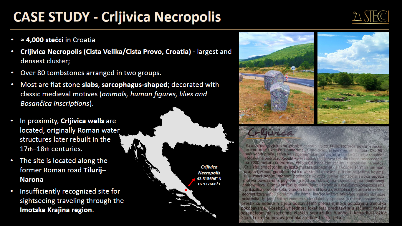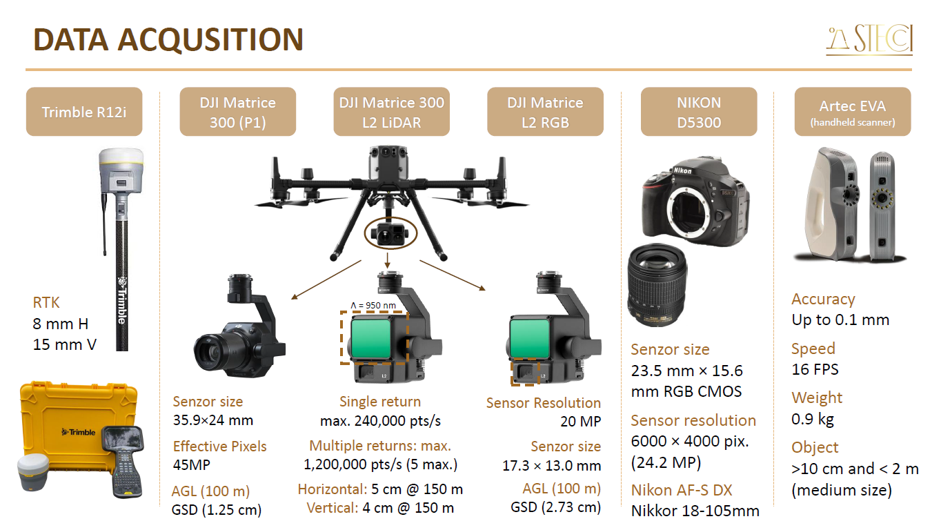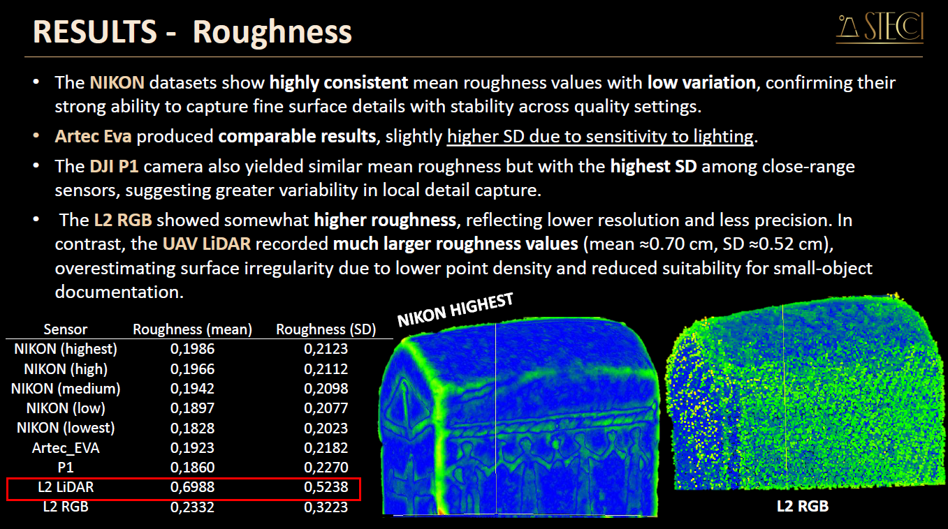 Centar za geoprostorne tehnologije (GAL) sudjelovao je na konferenciji „1st STECCI Conference: Preserving Cultural Heritage in Times of Climate Change“, održanoj 25.–27. rujna 2025. na University of Applied Arts Vienna, gdje smo predstavili rad „3D dokumentiranje stećaka upotrebom visokorezolucijskog ručnog 3D skenera i bliskopredmetne fotogrametrije za očuvanje kulturne baštine“. U okviru EU Horizon STECCI projekta, pokrenutog 2023. u svrhu razvoja održivih i inovativnih strategija zaštite europske kulturne baštine s posebnim naglaskom na stećke i rizike povezane s klimatskim promjenama, proveli smo snimanja na lokalitetu Crlivički stećci i bunari kod Imotskog (Hrvatska). U procesu prikupljnja podataka korišteni su Artec Eva (strukturirano svjetlo), DSLR sustav Nikon D5300 s objektivom AF-S DX Nikkor 18–105 mm te UAV DJI Matrice 300 s kamerom P1 i L2 LiDAR/RGB senzorom, uz izradu 3D modela metodom SfM fotogrametrije. Komparativna analiza pokazala je da DSLR fotogrametrija, uz pravilne postavke i uspostavu lokalnog koordinatnog sustava, pruža najdetaljnije i troškovno najučinkovitije rezultate; ručni skener (Artec Eva) daje vrlo točne modele u stvarnom vremenu, ali je osjetljiv na snažno sunčevo svjetlo na otvorenom; UAV fotogrametrija (P1) nudi dobar kompromis između detalja i pokrivenosti, dok je UAV LiDAR (L2) optimalan za veće ili vegetirane površine, ali nije prikladan za male spomenike koji zahtijevaju subcentimetarsku razinu detalja. Iako u ovoj fazi nije primijenjen, TLS ostaje referentni standard visoke preciznosti i poslužit će kao mjerilo u budućim istraživanjima. Preporučeni je integrirani pristup: DSLR za fine detalje, UAV LiDAR (i TLS) za šire otvorene površine te Artec Eva za zatvorene prostore, čime se osigurava robustan i skalabilan postupak digitalne dokumentacije stećaka.