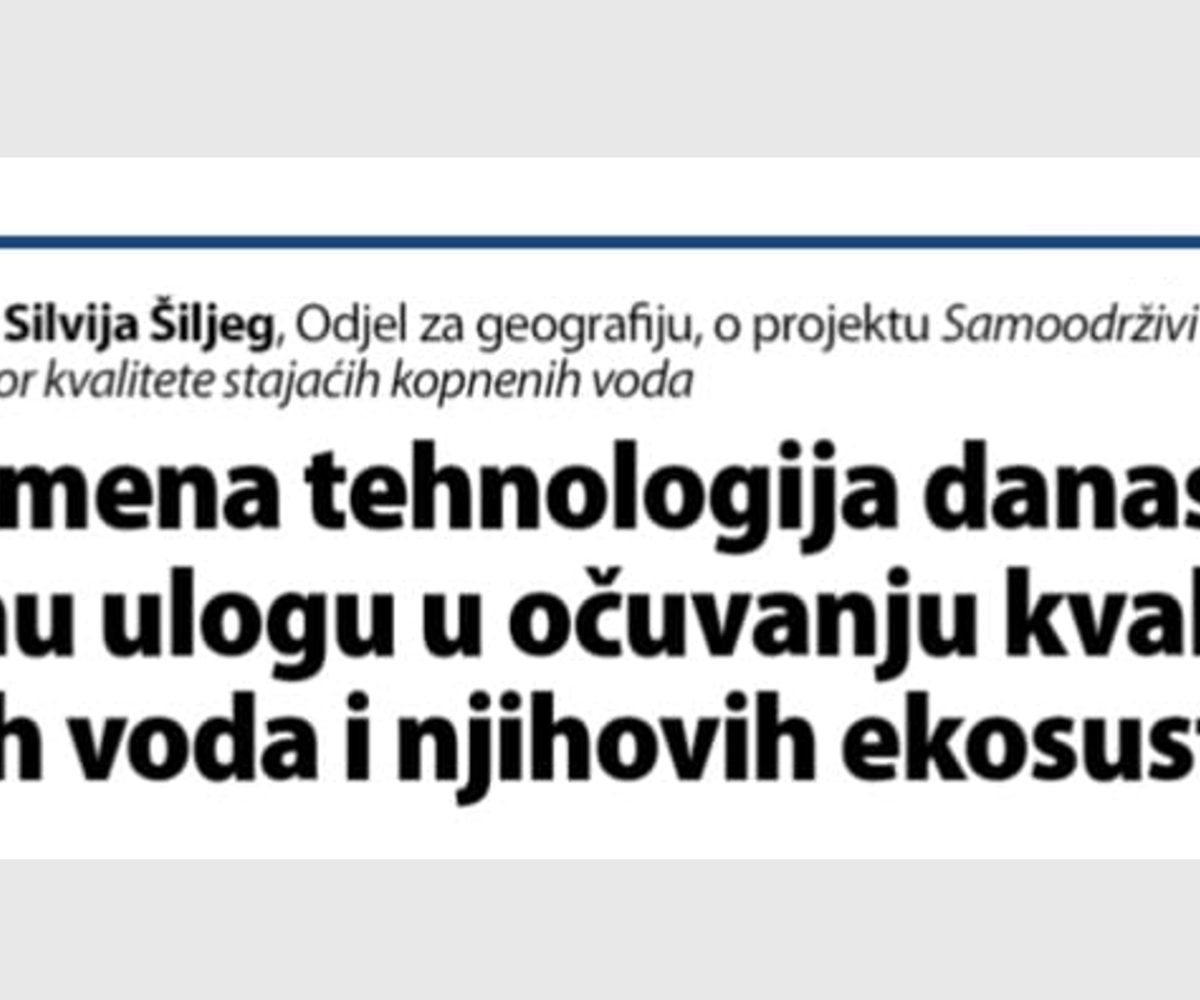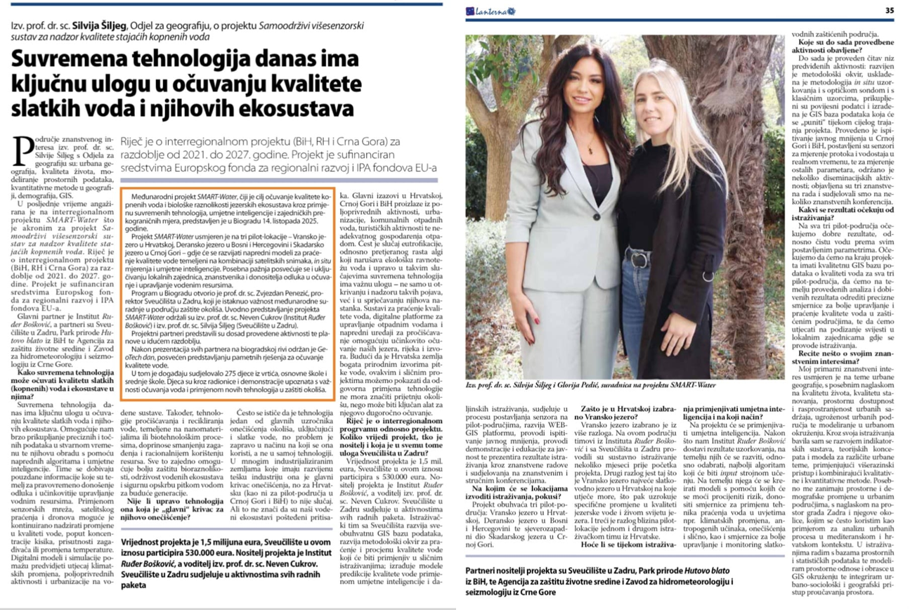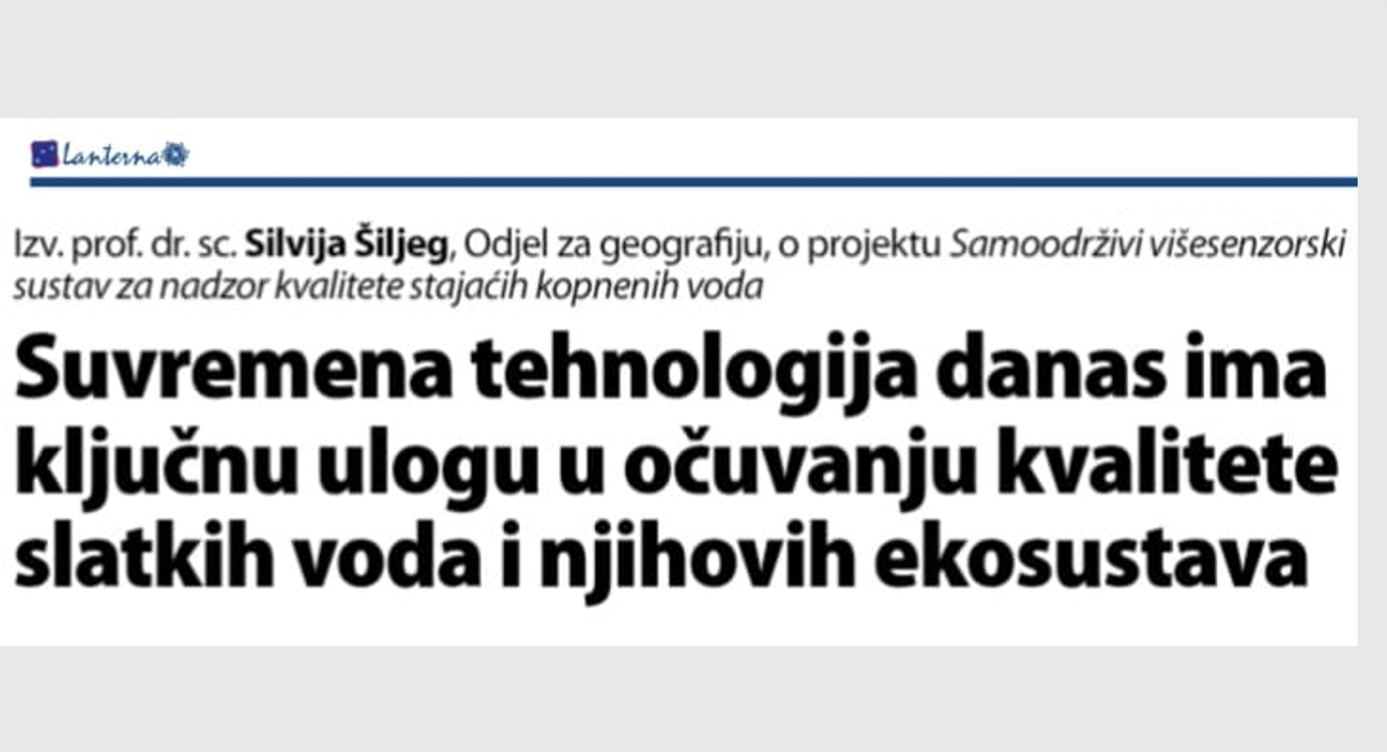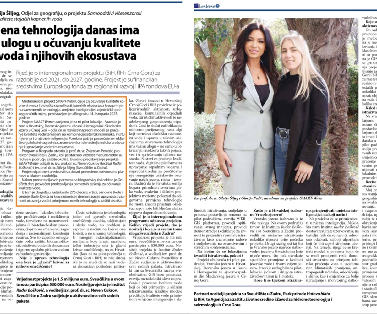 U najnovijem broju časopisa Lanterna objavljen je članak u kojem je izv. prof. dr. sc. Silvija Šiljeg predstavila projekt SMART-Water – „Samoodrživi višesenzorski sustav za nadzor kvalitete stajaćih kopnenih voda“, koji se provodi kao interregionalna suradnja Hrvatske, Bosne i Hercegovine i Crne Gore u razdoblju 2021.–2027., uz sufinanciranje sredstvima Europskog fonda za regionalni razvoj i IPA fondova EU-a. U članku se ističe da projekt razvija integrirani pristup praćenju kvalitete vode temeljen na kombinaciji satelitskih snimaka, in situ mjerenja, GIS analiza i suvremenih digitalnih rješenja, s naglaskom na tri pilot-lokacije: Vransko jezero, Deransko jezero i Skadarsko jezero, te na uključivanje lokalnih zajednica i donositelja odluka u očuvanje vodenih resursa. Dodatno se naglašavaju ključni izazovi poput poljoprivrednih pritisaka, urbanizacije, komunalnih otpadnih voda, turizma i neadekvatnog gospodarenja otpadom, uključujući pojave eutrofikacije, pri čemu suvremena tehnologija ima važnu ulogu ne samo u otkrivanju i nadzoru, nego i u sprječavanju rizičnih stanja.
