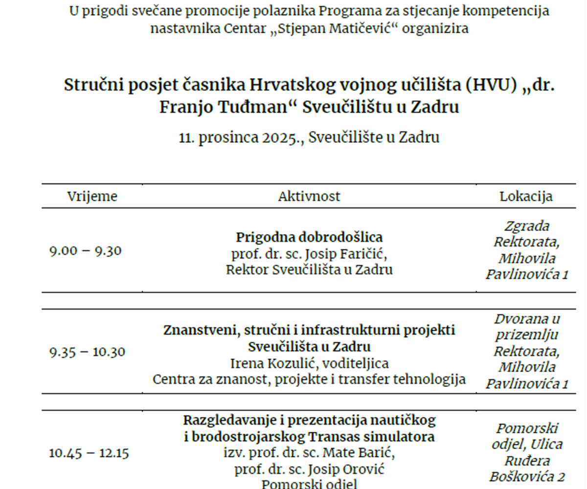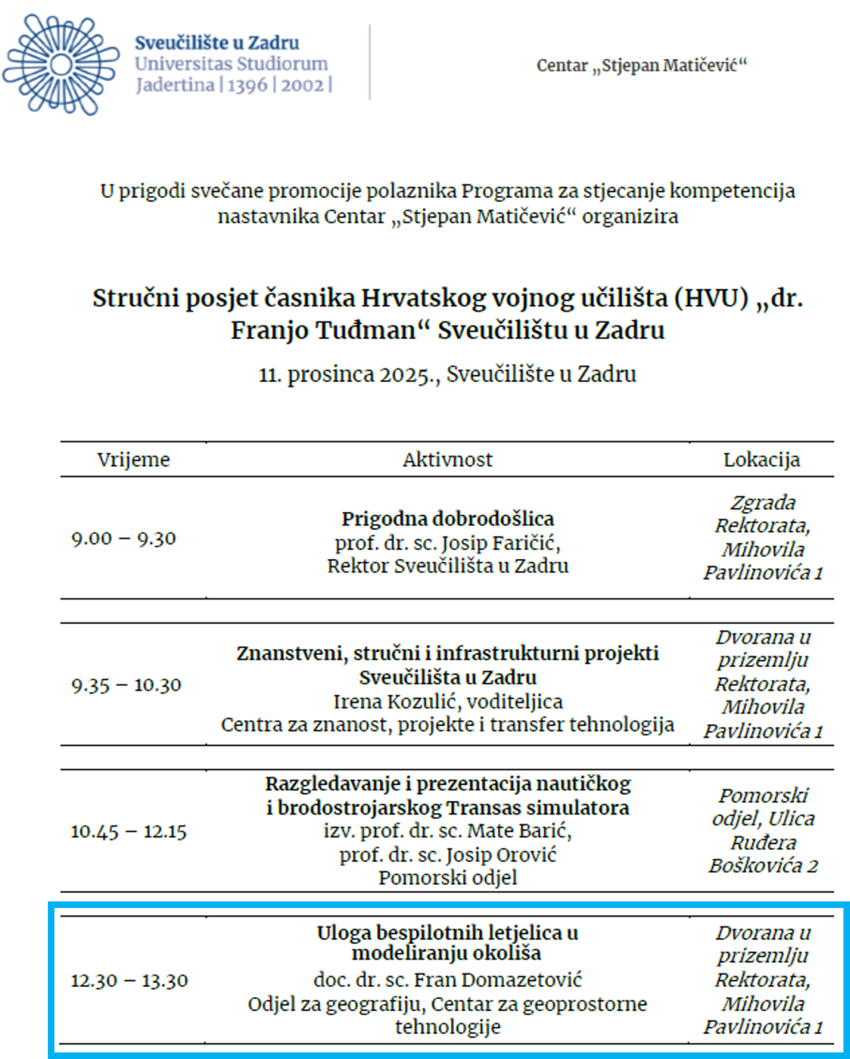 U sklopu stručnog posjeta časnika Hrvatskog vojnog učilišta „dr. Franjo Tuđman“ Sveučilištu u Zadru, u organizaciji Centra Stjepan Matičević, doc. dr. sc. Fran Domazetović održao je predavanje posvećeno ulozi bespilotnih letjelica (UAV) u suvremenom modeliranju okoliša. Predavanje je bilo usmjereno na prikaz kako se UAV sustavi, u kombinaciji s naprednim senzorima i geoprostornim tehnologijama, koriste za brzo, precizno i sigurno prikupljanje prostornih podataka, uz poseban naglasak na primjenu u kartiranju terena te procjeni posljedica požara, erozije i poplava, osobito u teško dostupnim i rizičnim područjima. Kroz konkretne primjere terenskih i znanstvenih istraživanja predstavljene su mogućnosti bespilotnih letjelica u podršci donošenju odluka, planiranju intervencija i upravljanju prostorom, što ih čini vrijednim alatom i u vojnom i sigurnosnom kontekstu. Predavanje je potaknulo raspravu o potencijalu bespilotnih sustava kao poveznice između znanosti, obrane i civilne zaštite te o njihovoj sve važnijoj ulozi u razumijevanju i zaštiti okoliša.
